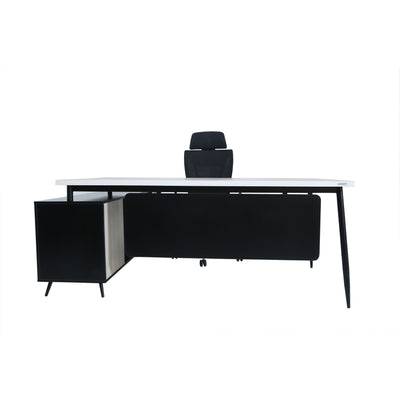The integrated side storage rack features drawers, shelving, and a shutter compartment, offering efficient organization for documents and office essentials. Built with premium materials and strong MS framing, it ensures long-lasting performance in demanding professional environments.