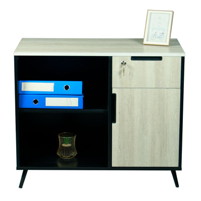 The integrated side rack includes a drawer, shutter cabinet, and open shelf, offering practical storage for documents, files, and essentials. With optional left or right orientation, it adapts seamlessly to different office layouts.